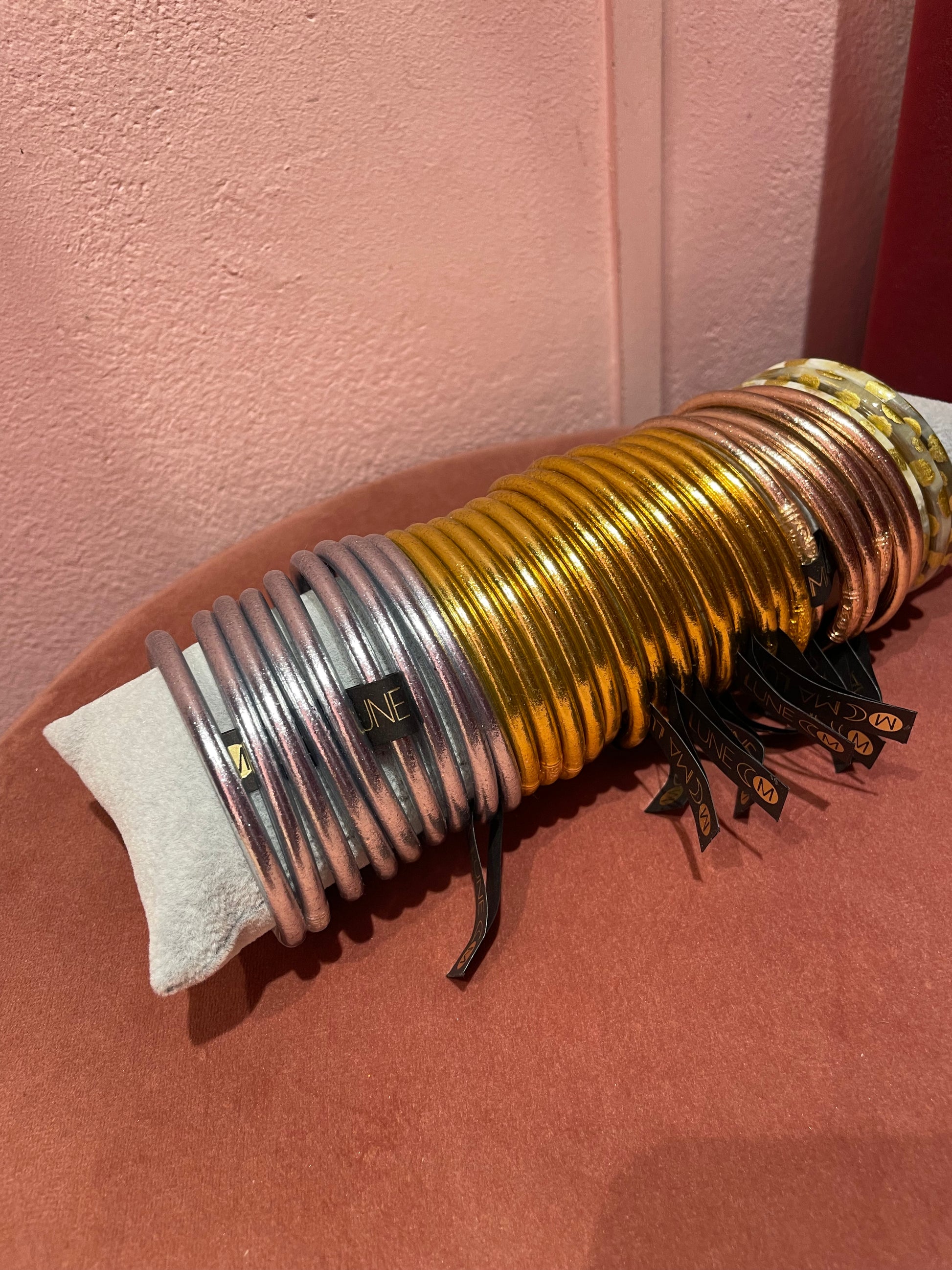 Indossati con numeri dispari - il che porta fortuna, poiché il potere dei numeri dispari non è divisibile - questi braccialetti originali esistono solo nei colori dell'oro naturale. Le lamine dorate rivestono i preziosi braccialetti!