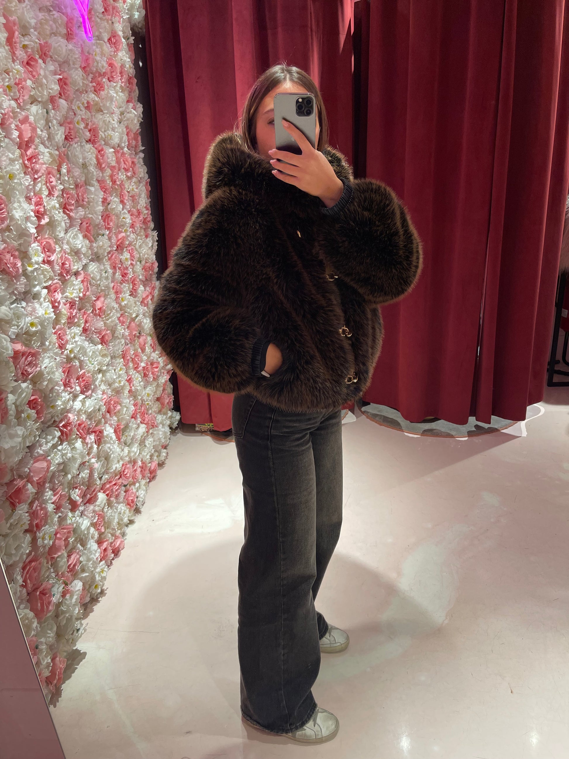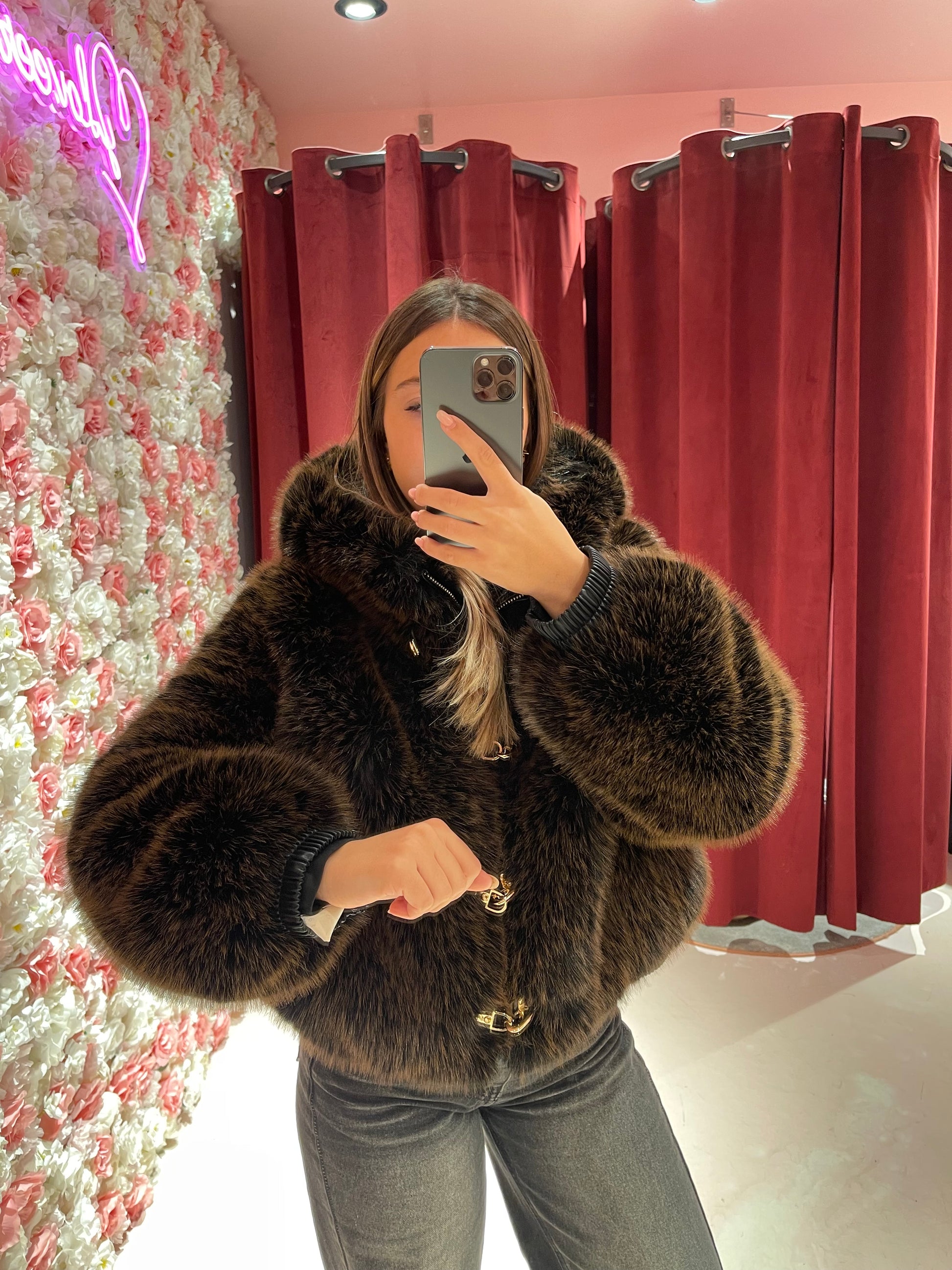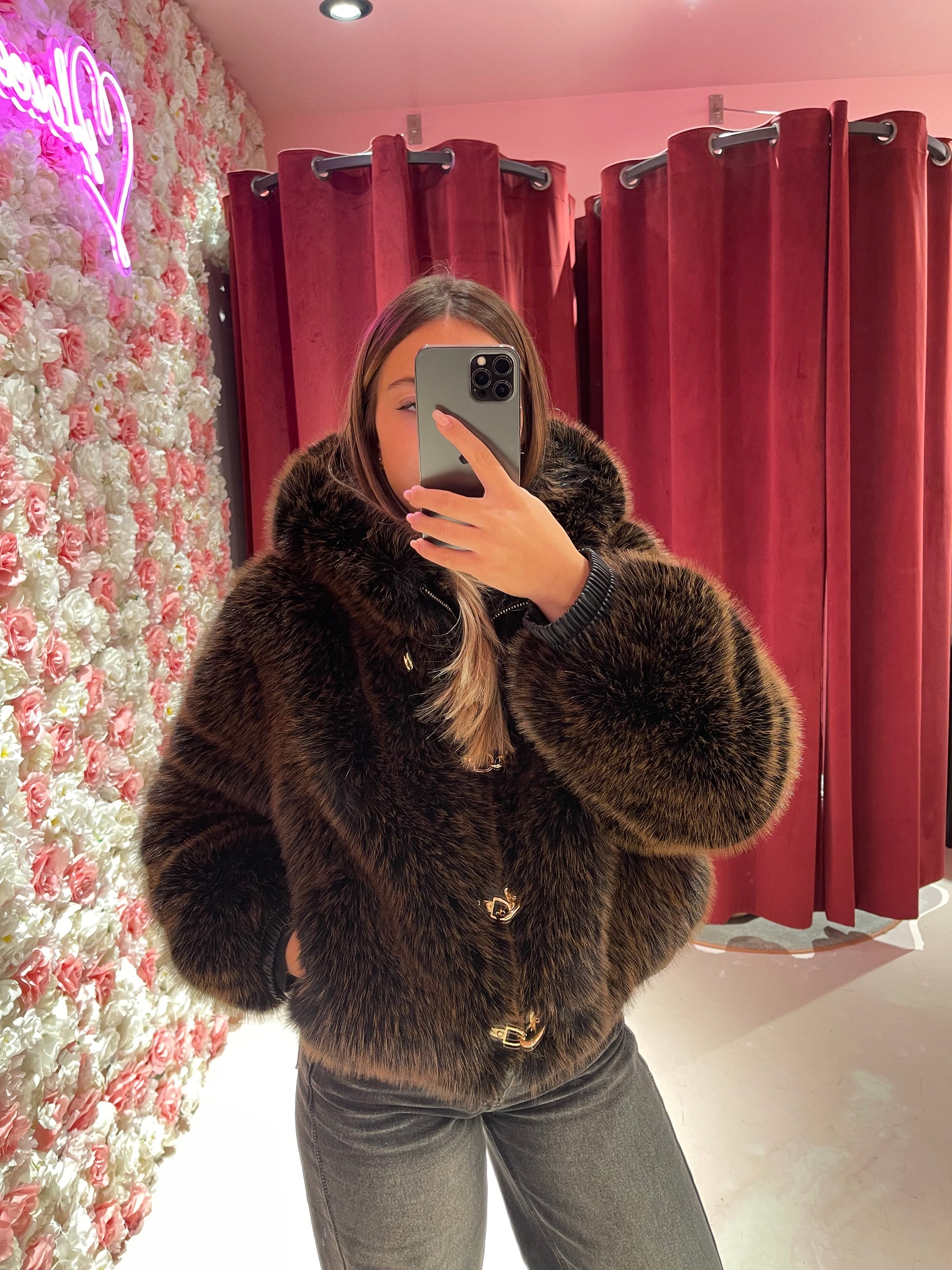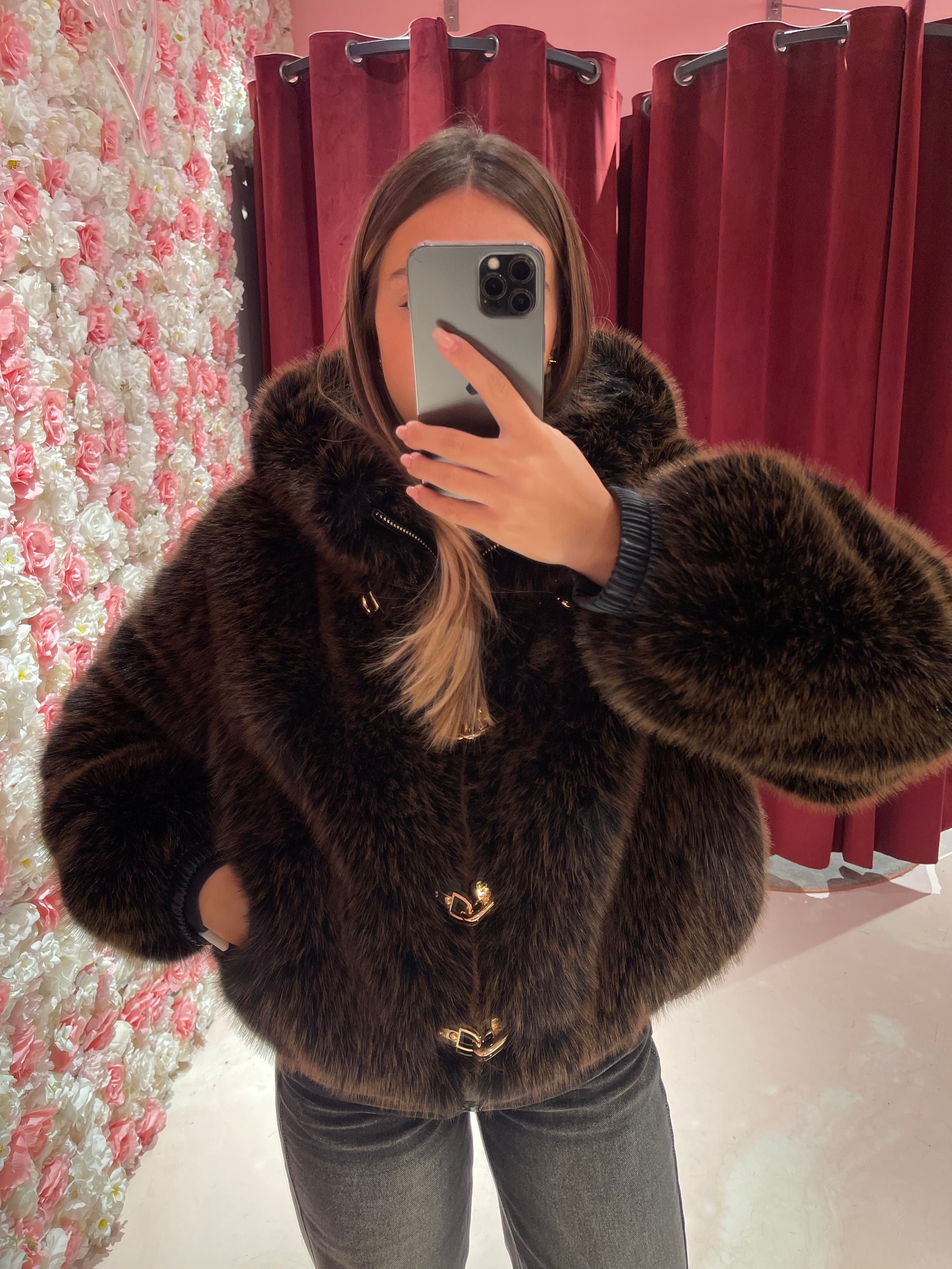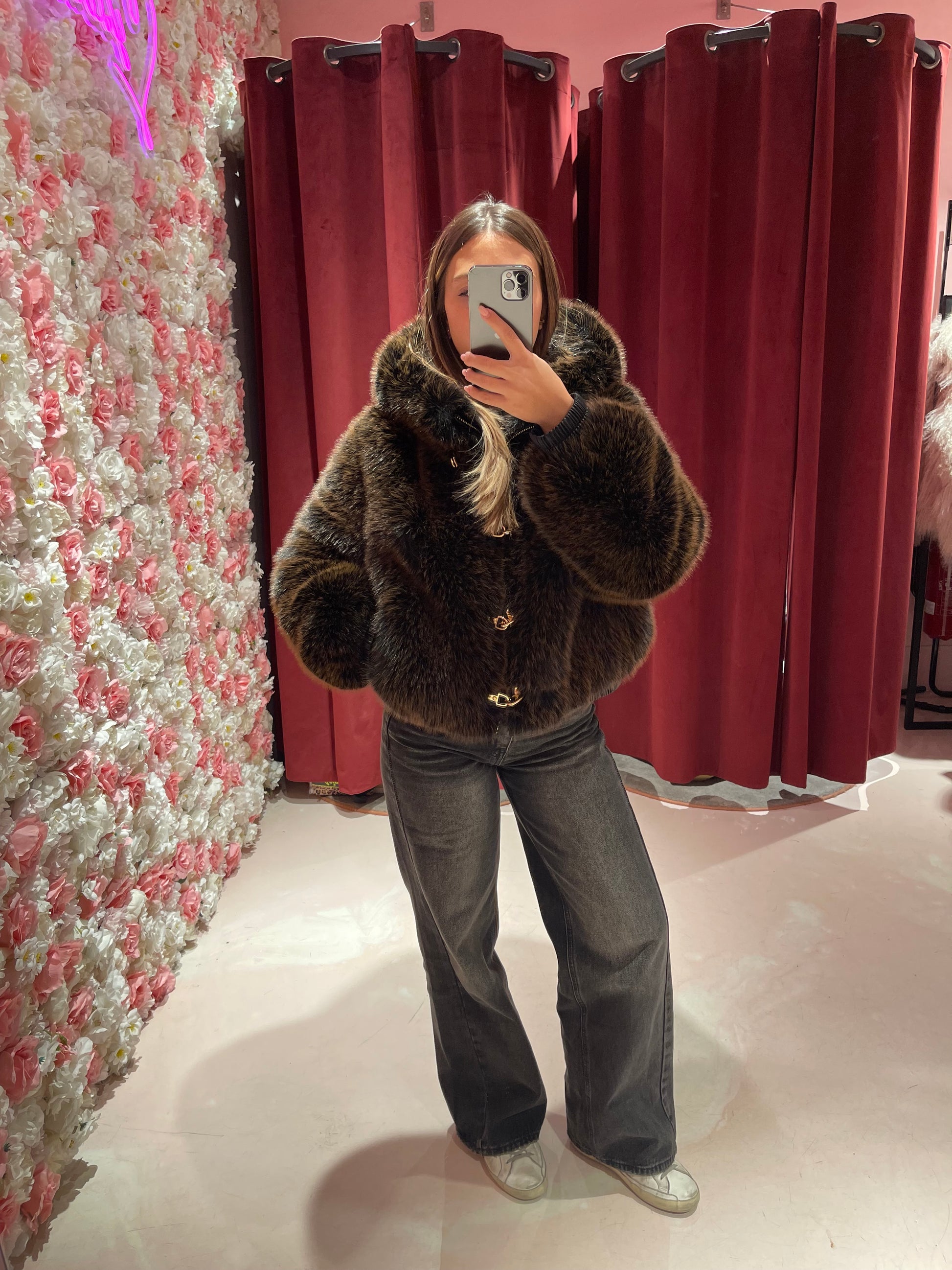 Eco pelliccia fibbie e cappuccio cioccolato/nero Uc