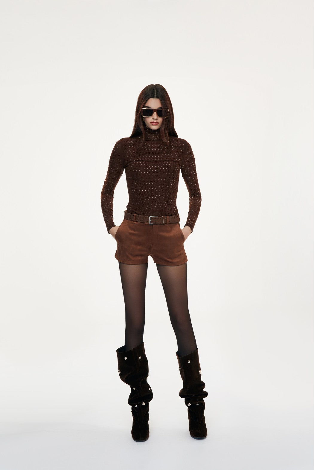 Maglia a collo alto. Vestibilità aderente. Maniche lunghe. Tulle trasparente. Strass applicati su tutta la superficie.