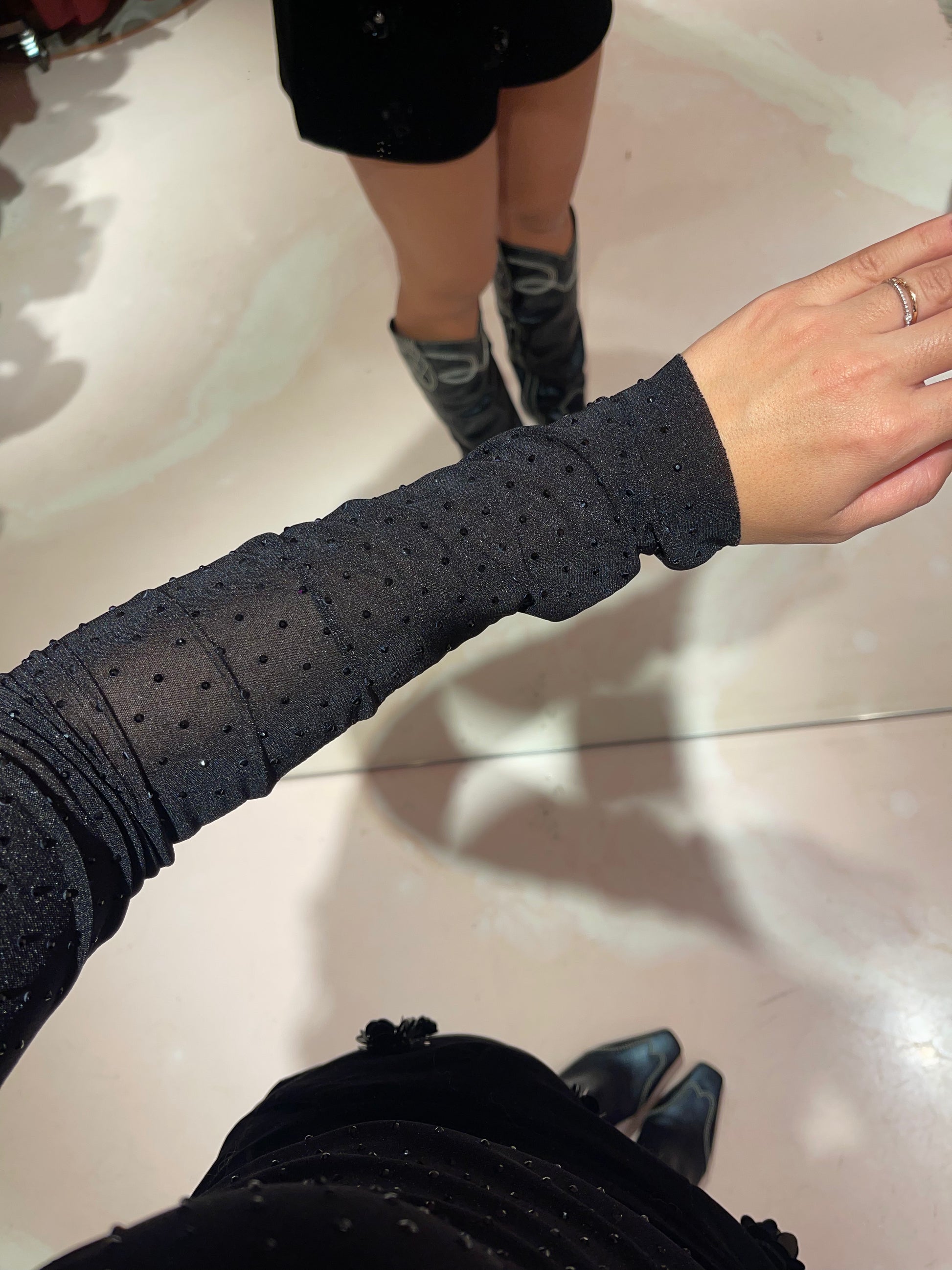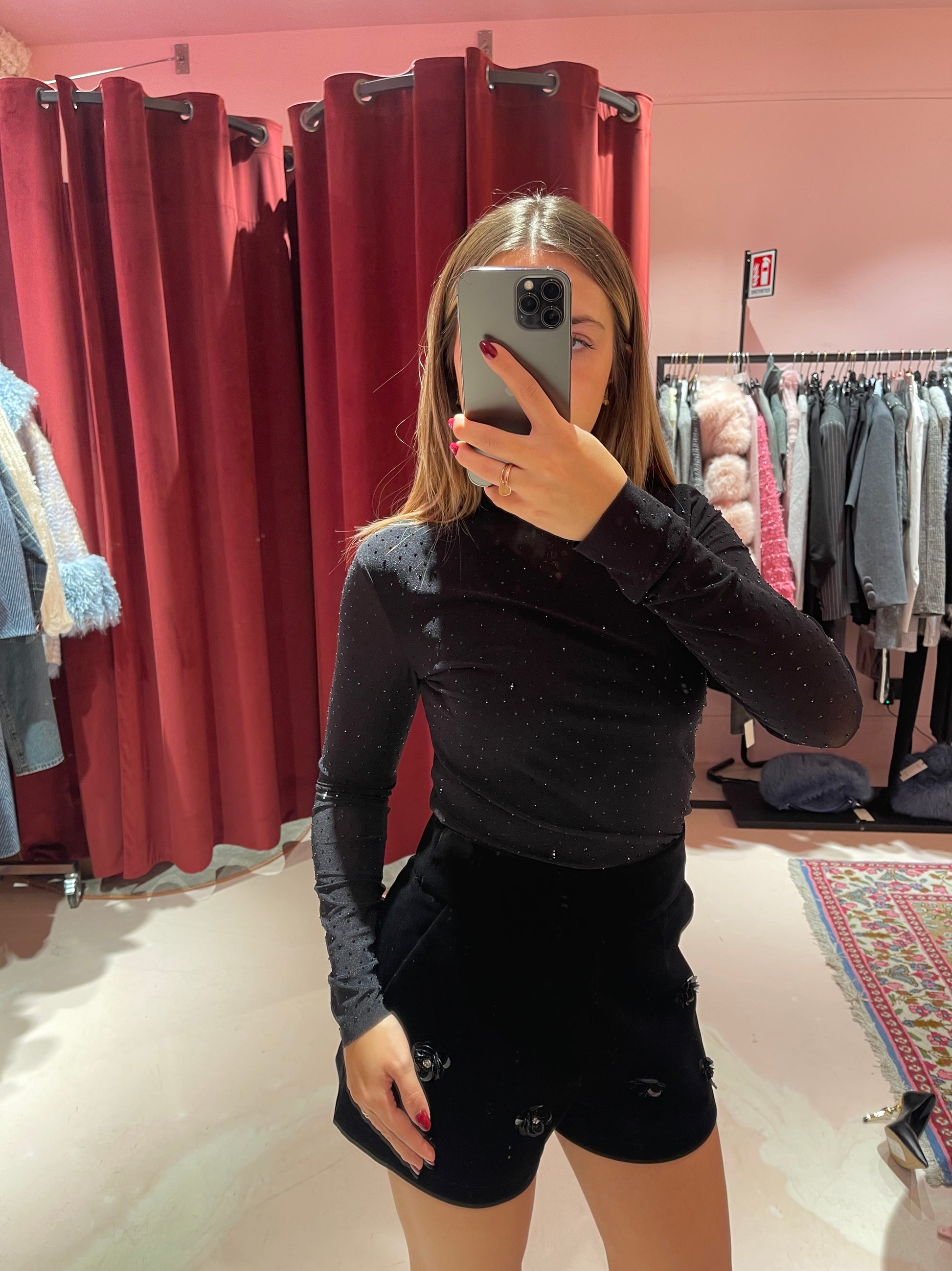 Maglia a collo alto. Vestibilità aderente. Maniche lunghe. Tulle trasparente. Strass applicati su tutta la superficie.
