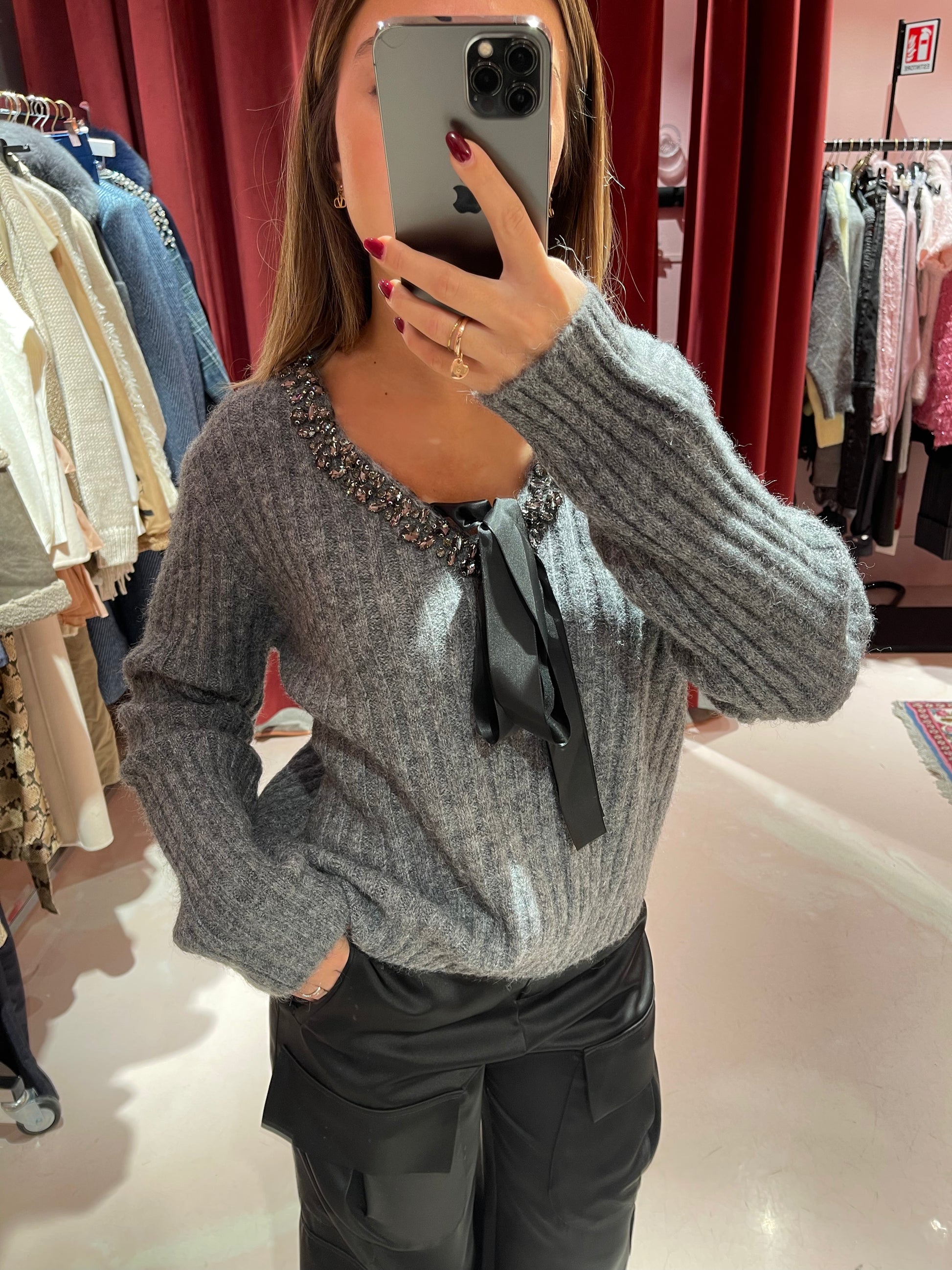 Maglione con scollo a V. Decorato con pietre e strass sul bordo dello scollo. Laccetto in raso nero da annodato sul davanti a formare un fiocco. Lavorazione a costine verticali sul busto e sulle maniche.