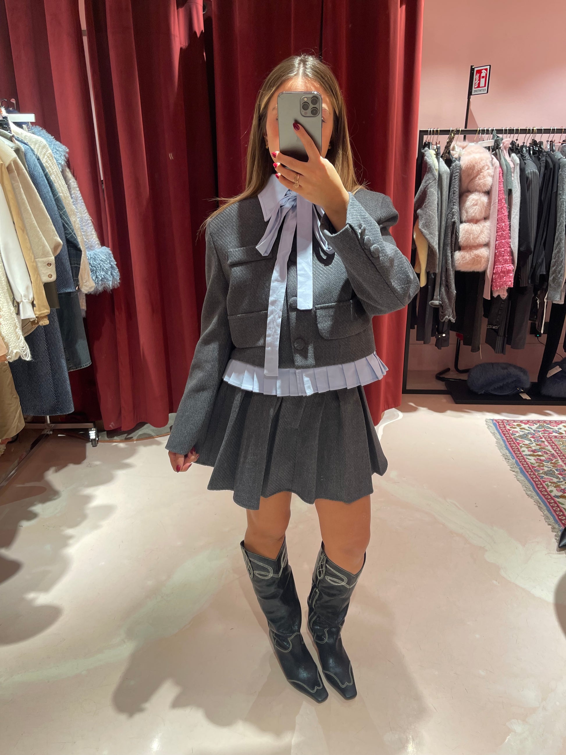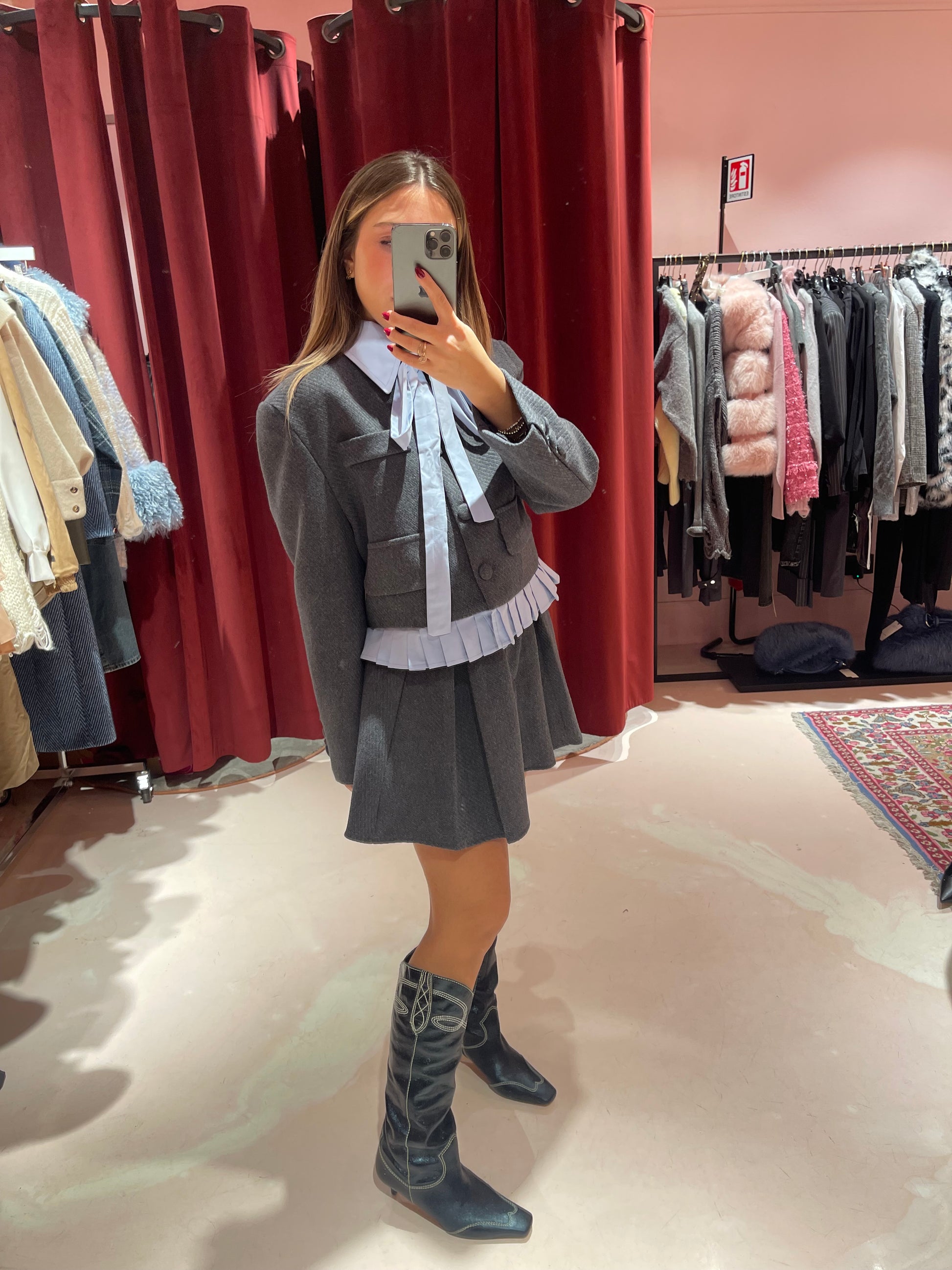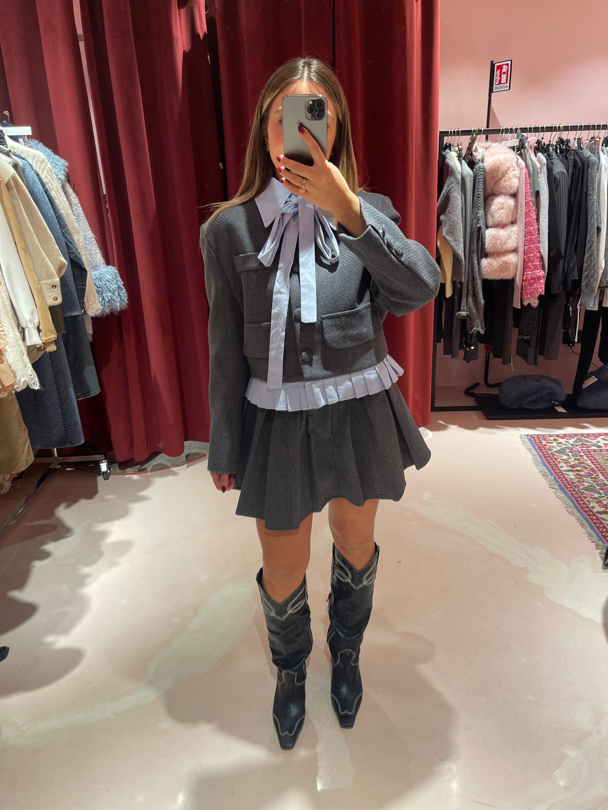 Giacca corta a maniche lunghe. Colletto a contrasto con laccetti. Chiusura con bottoni. Dettaglio di due taschini applicati e arricciatura sul fondo.