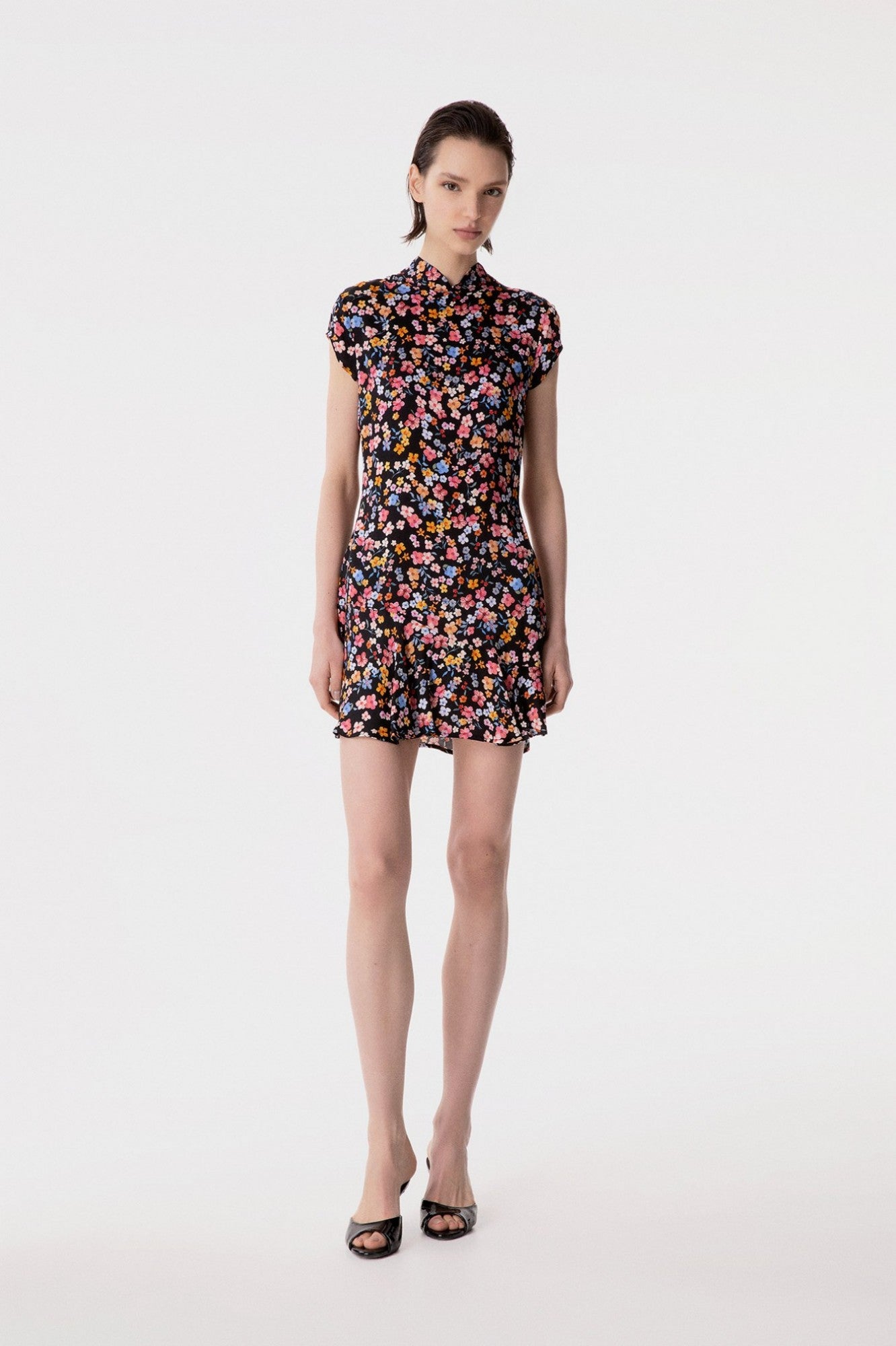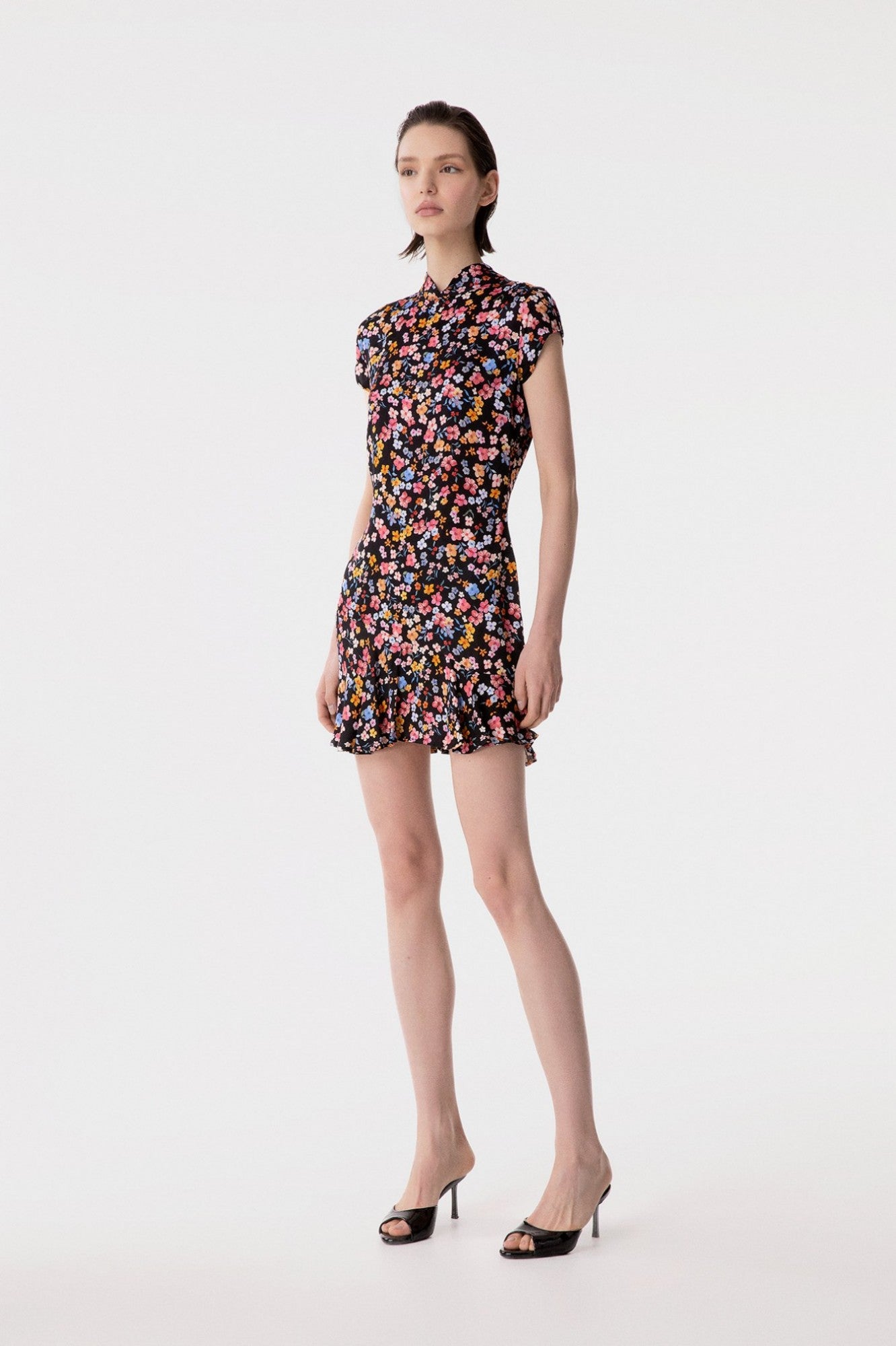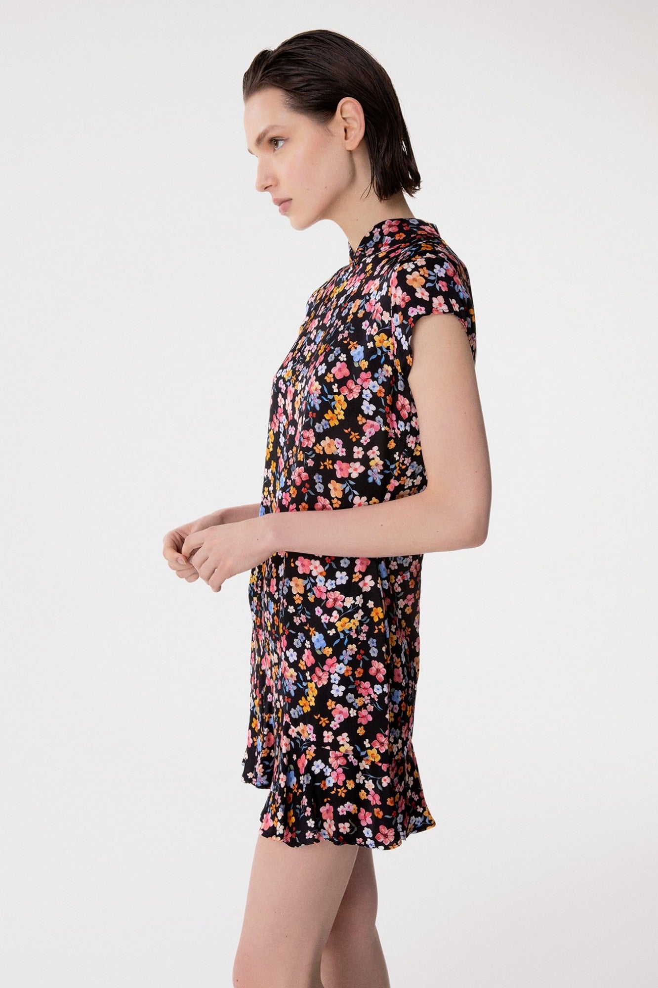 Swami - Abito Corto Mezza Manica, Collo Alla Coreana Con Volant Sul Fondo • Bouquet Nero Mar de Margaritas